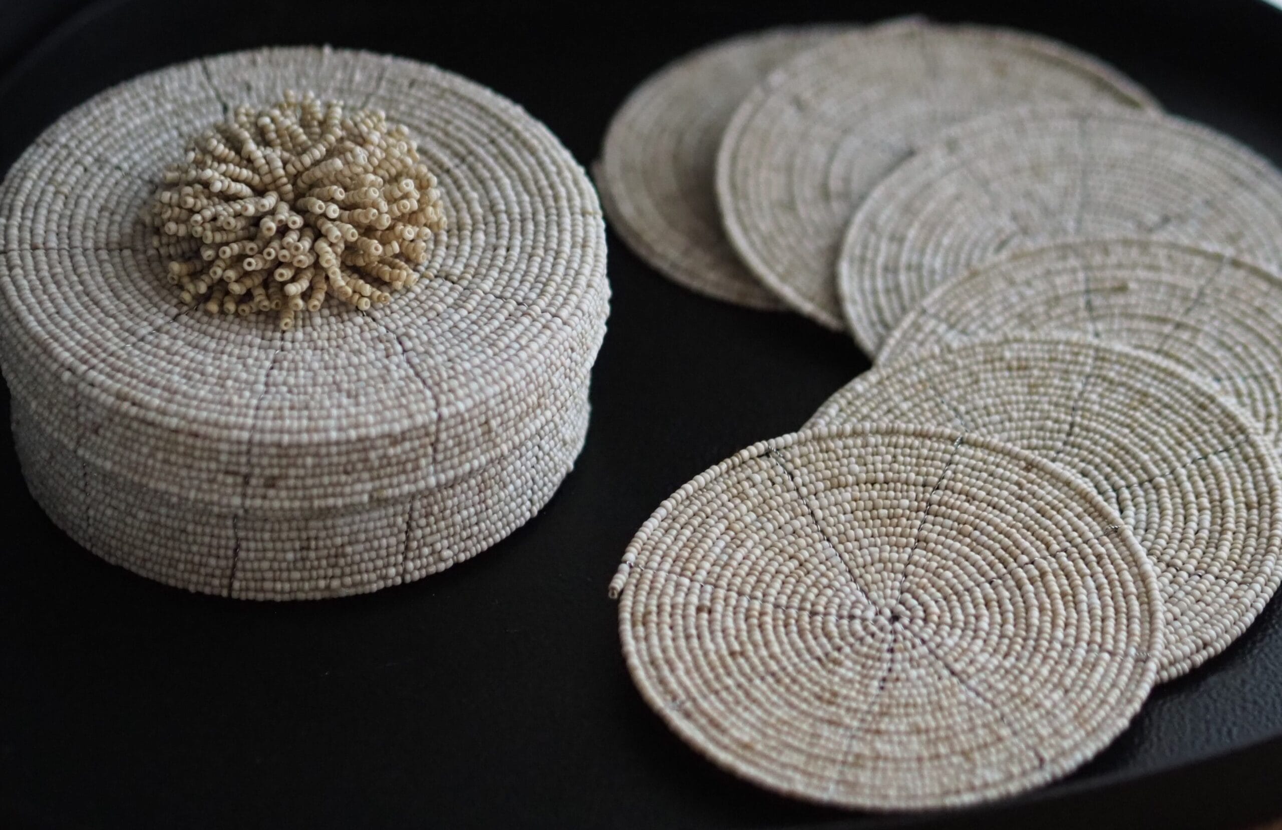 Hoé leuk is deze glaskralen opbergbox inclusief 6 onderzetters? Ze zijn volledig geregen met glaskralen in een beige kleur. De deksel is versierd met een trosje van grote en kleine kralen. Een stijlvolle oplossing om je onderzetters netjes op te bergen en tegelijkertijd een prachtig item toe te voegen op tafel of op een mooi dienblad. Het is ook een perfect item om te geven als cadeautje!