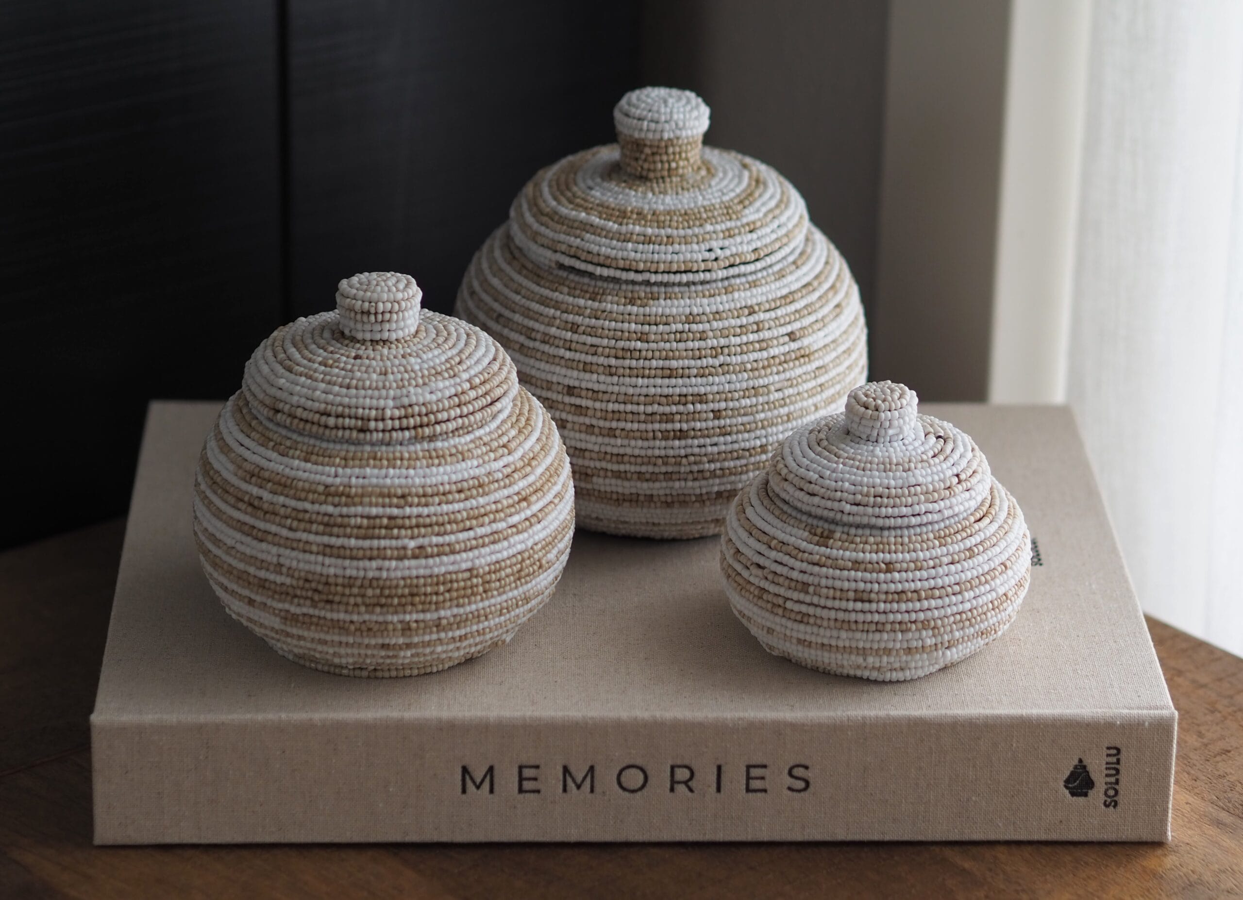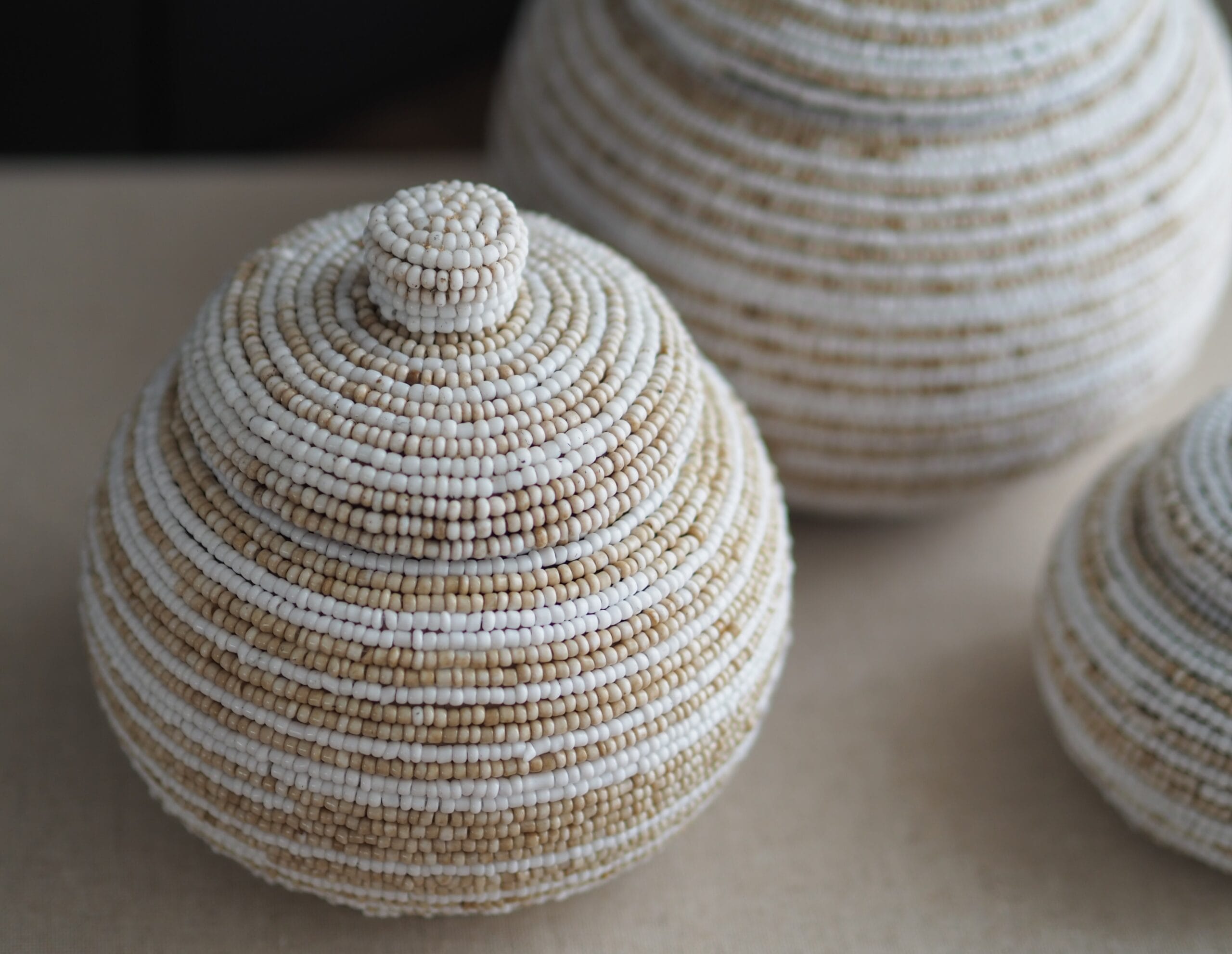 Hoé leuk zijn deze unieke kralen potjes? Ze zijn met de hand gemaakt door ambachtslieden in Indonesië. Deze unieke kralen potjes brengen een luxe, rustige en stijlvolle sfeer in je interieur. Ze zijn prachtig ter decoratie, maar ook is het mogelijk om er iets kleins in op te bergen. Ze zijn er in 3 verschillende afmetingen in de prachtige kleuren mix van beige en wit.