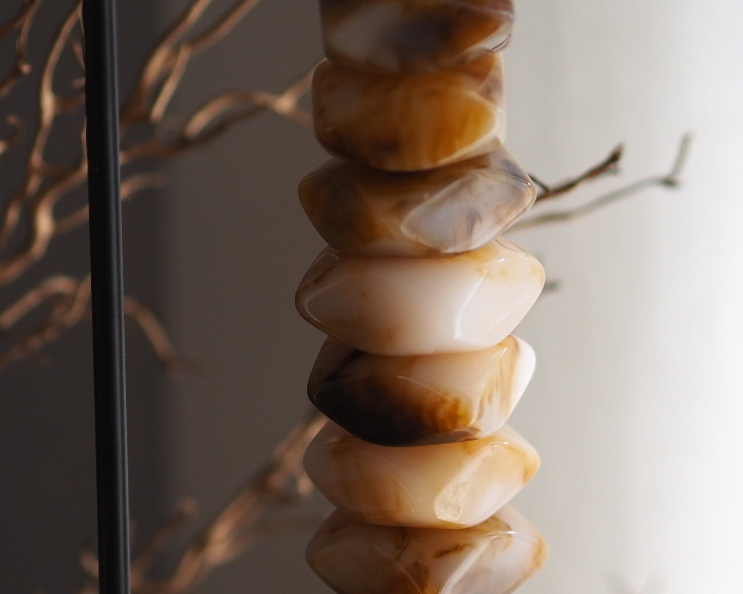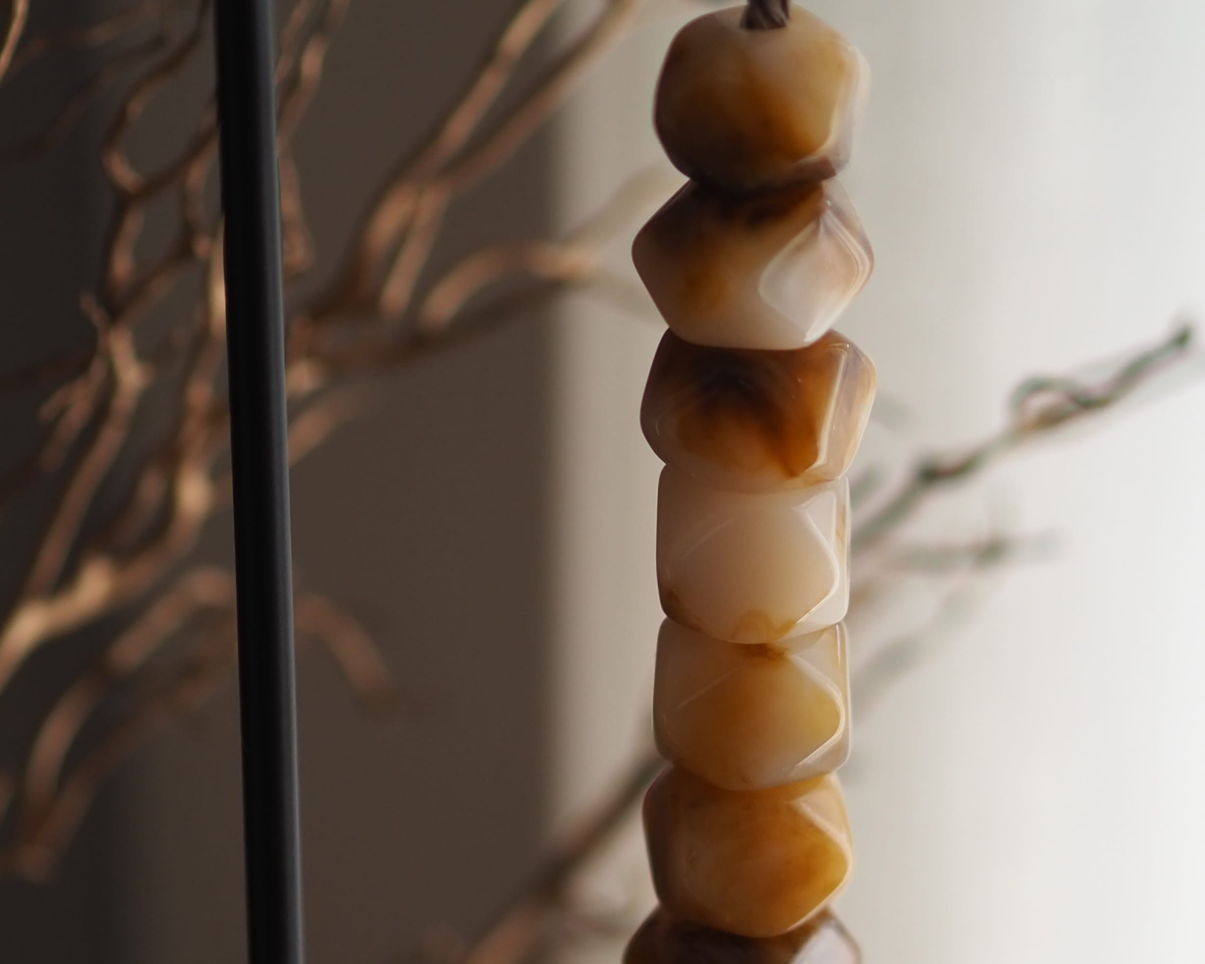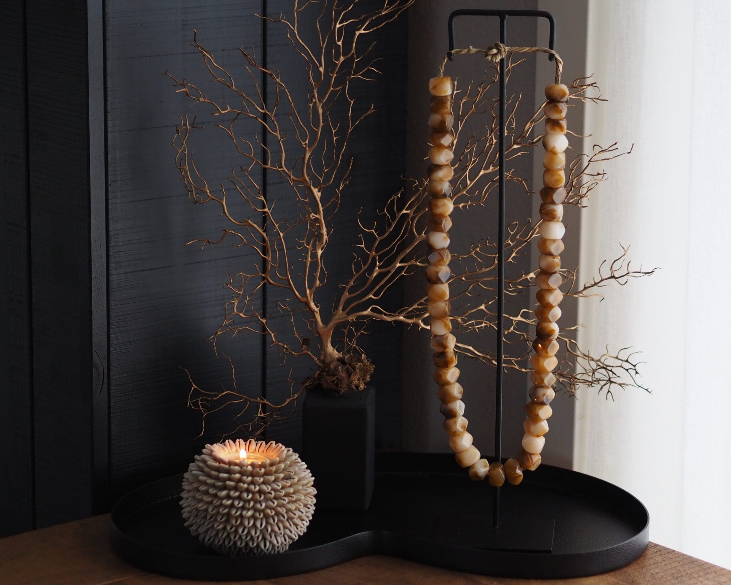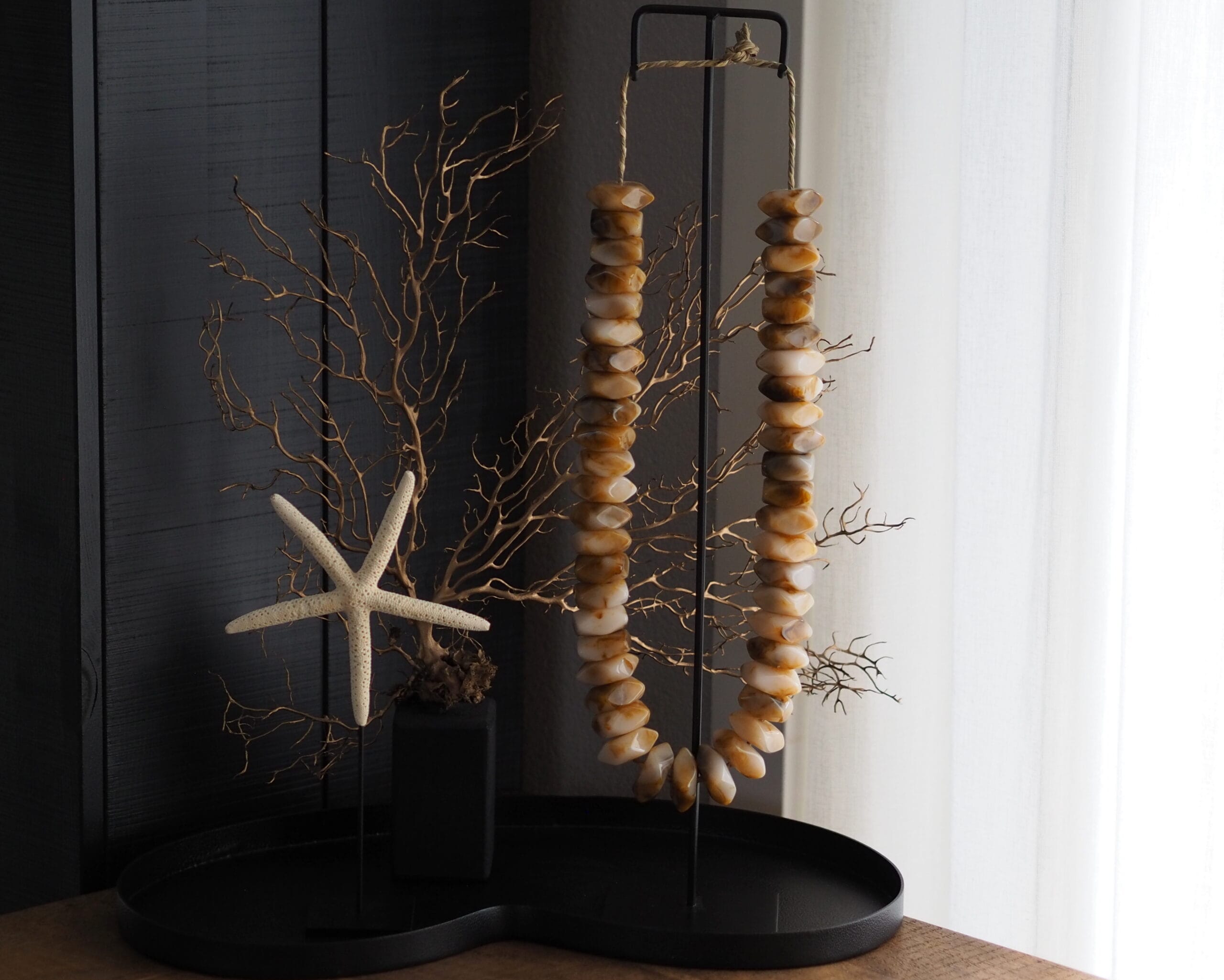 Op zoek naar luxe woondecoratie met een wow effect? Dan zijn onze nieuwe kralen items echt iets voor jou! De gemêleerde kralenketting dat op een zwart standaard word gepresenteerd is er in twee verschillende Afmetingen. De ketting is een echte sfeermaker door de prachtige en warme kleuren combinatie.