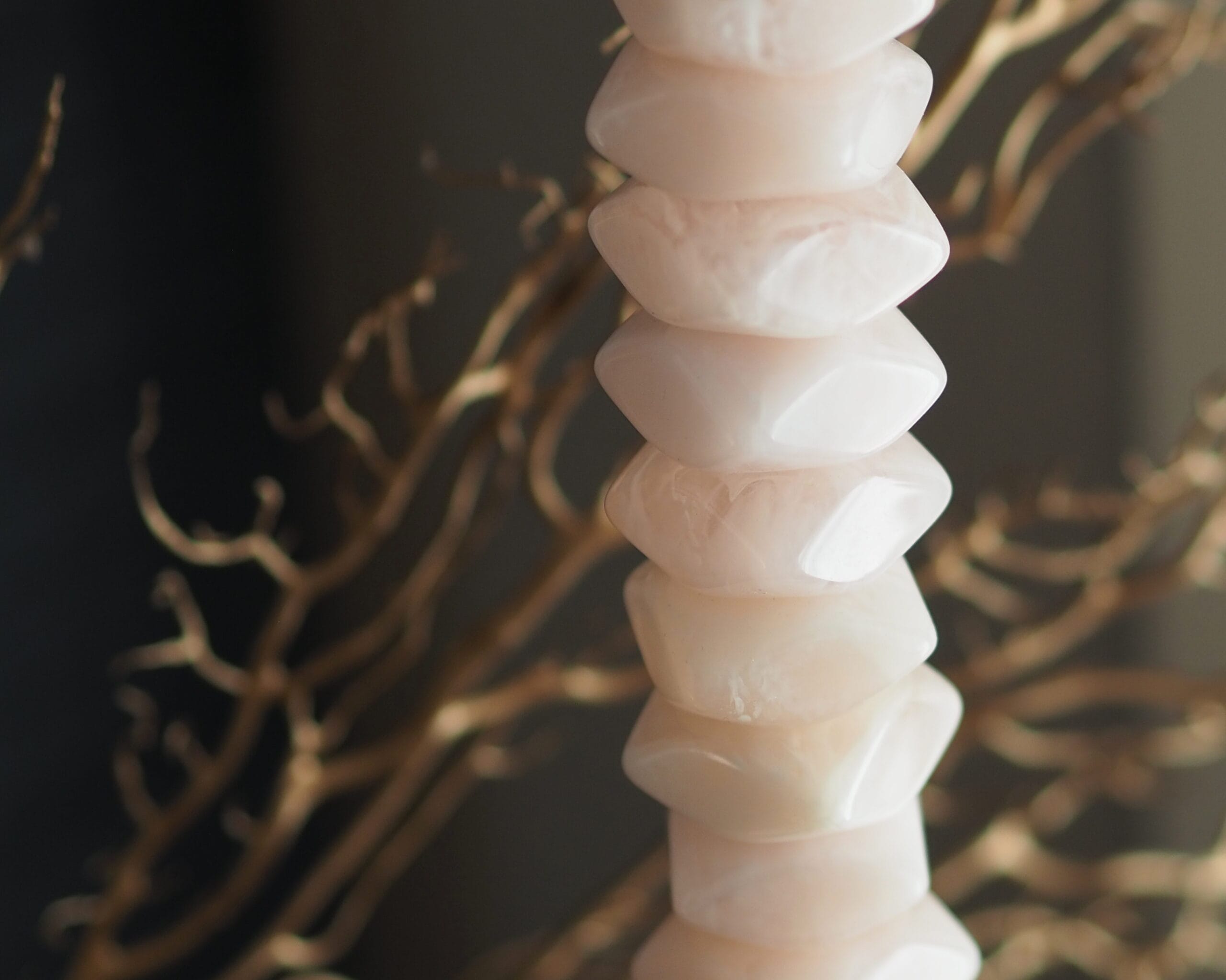 We hebben een prachtige nieuwe kralenketting aan onze collectie toegevoegd. Deze mooie licht roze kralenkettingen worden gepresenteerd op een zwart standaard. De kralen hebben een unieke vorm en zijn een mix van verschillende mooie witte en licht roze tinten.
